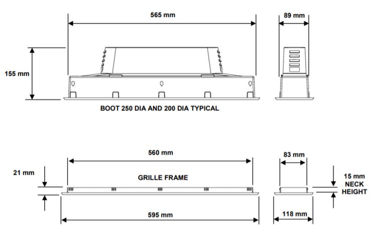 • Suggested cut out 90mm x 570mm for boots. Grille only installations will require a smaller cut-out hole for grille neck.